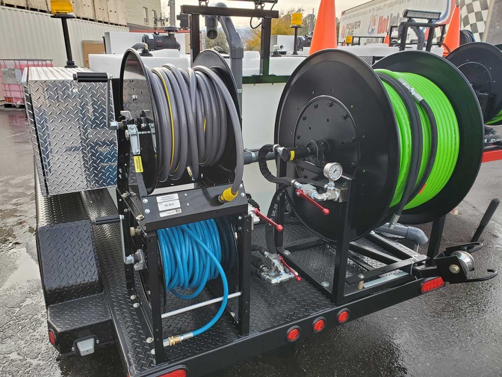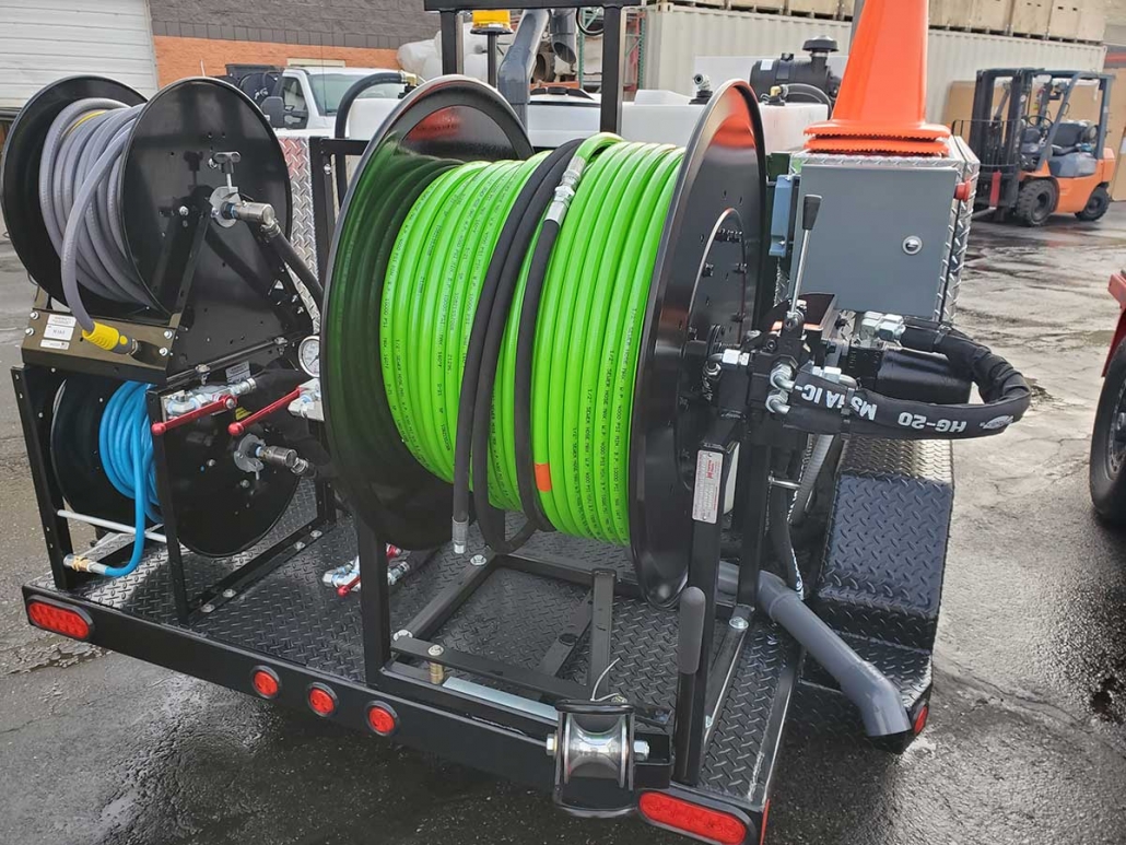 • Hydraulically Powered, Variable Speed Hose Reel with 500’ of 1/2” Jetting Hose Rated @ 16,000 PSI Burst Pressure
